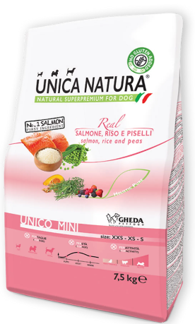 Szuper prémium kutyatáp kistestű kutyáknak minden életszakaszban. Emberi fogyasztásra alkalmas színhússal: lazaccal, rizzsel és borsóval.Unica Natura hivatalos oldala: https://www.gheda.eu